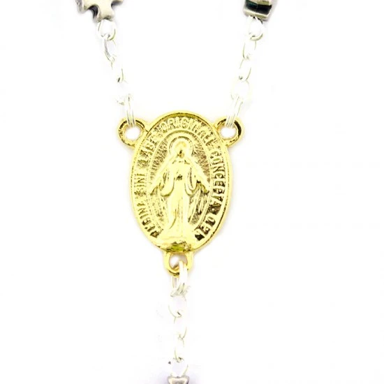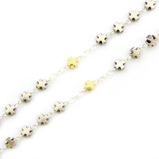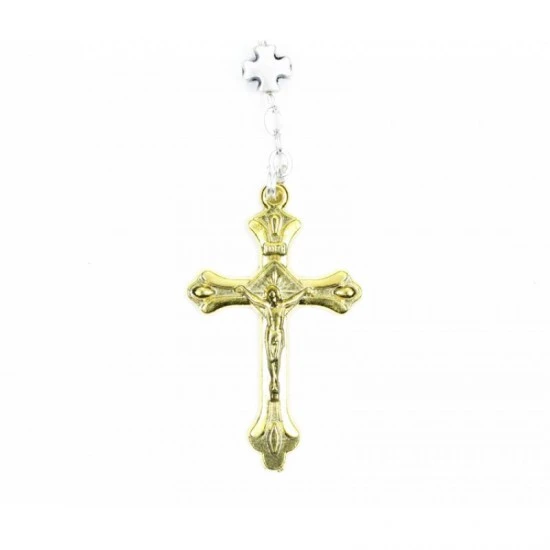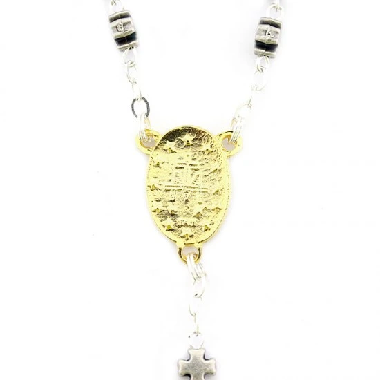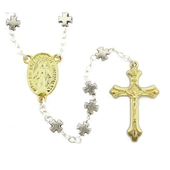 Rosario con grani a forma di crocette in metallo argentato. Il crocifisso, la crociera e i pater sono in metallo dorato.