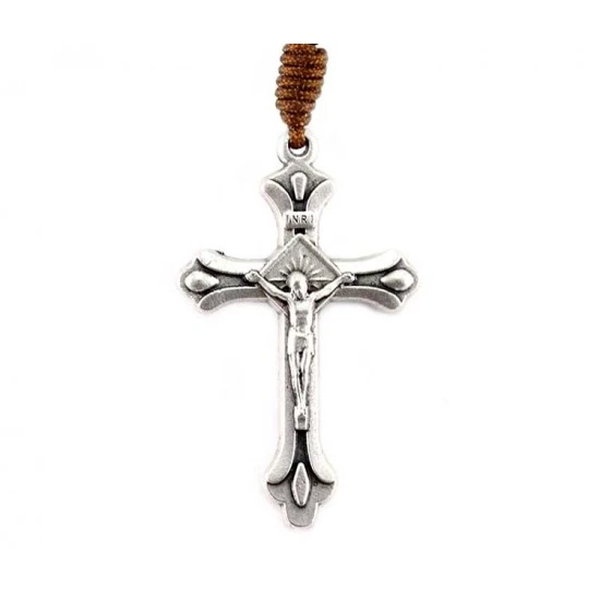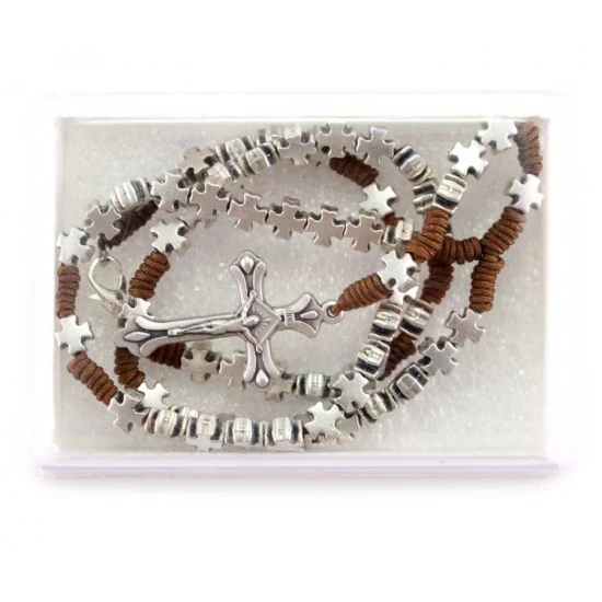Rosario Croci celtiche realizzato con grani composti da croci celtiche in metallo argentato legate con spago marrone. La croce pendente è in metallo argentato, il rosario è munito di gancio a molla per essere indossato.