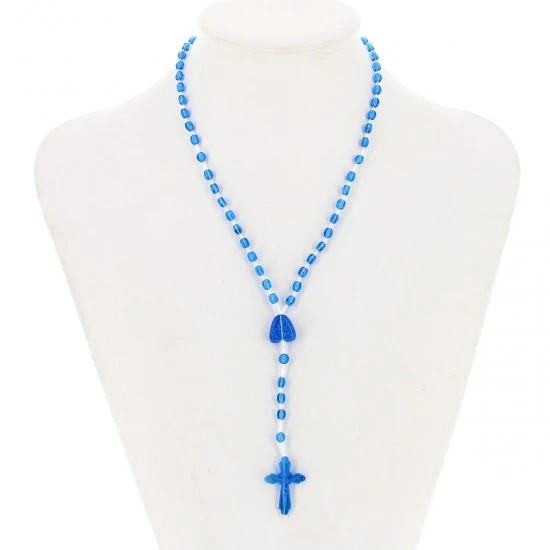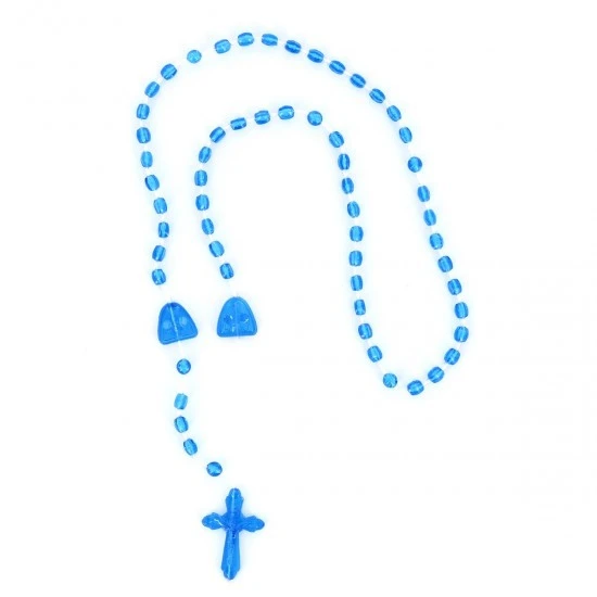 Rosario realizzato con grani in plastica legati da cordino bianco e crociera con bottoncino apre e chiudi utile per poter essere indossato comodamente al collo. Corredata di astuccio in plastica trasparente con immagine della Madonna Miracolosa. Made in Italy