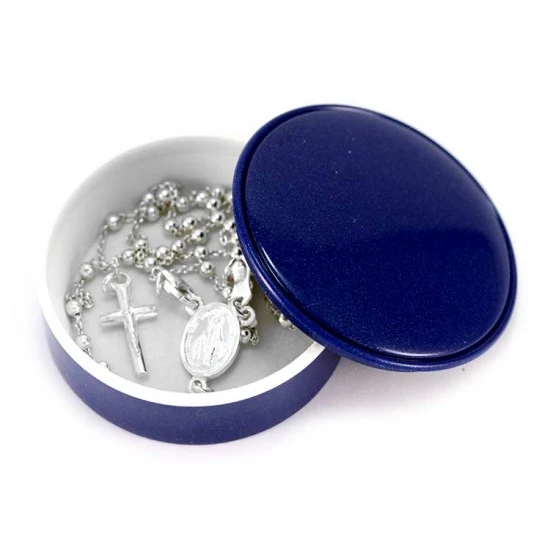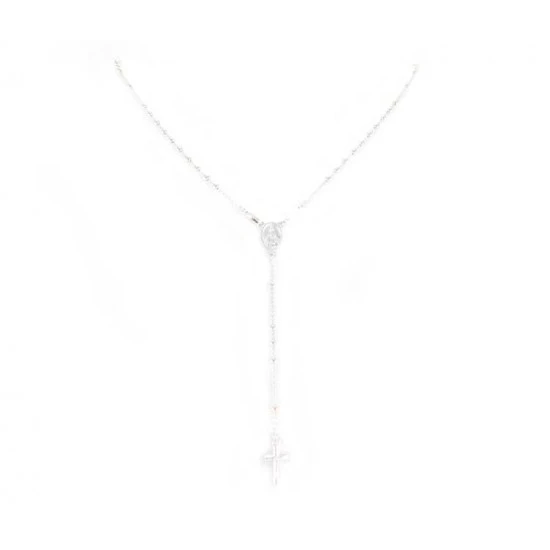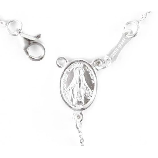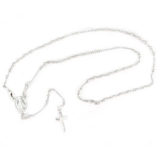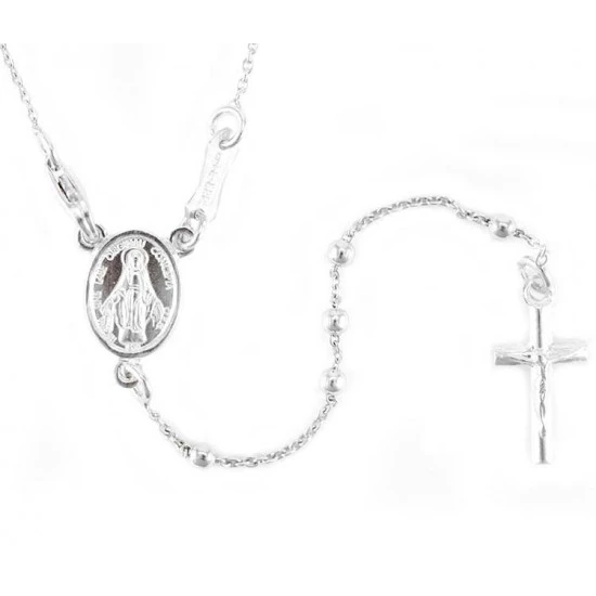 Rosario in argento 800°° con grani lisci e crociera Madonna Miracolosa. Il rosario è munito di gancio a moschettone utile per poter essere indossato.