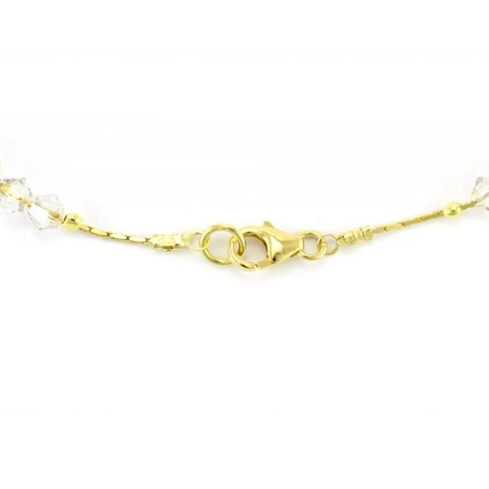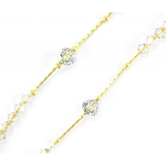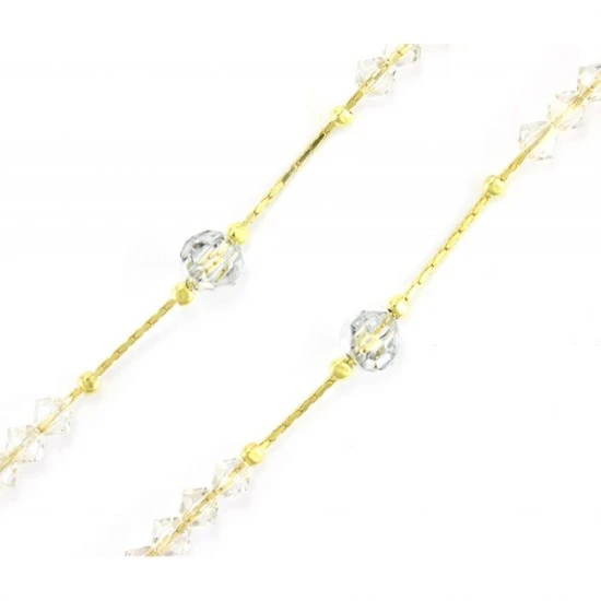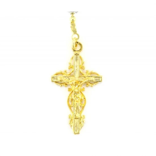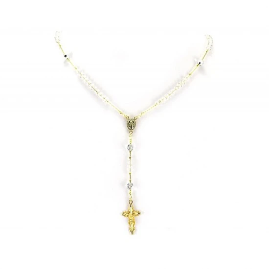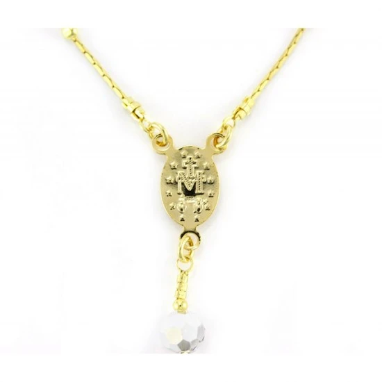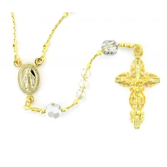 Rosario con grani in swarovski e legatura in argento 925° bagno oro con crociera della Madonna Miracolosa. Il rosario è munito di un comodo gancio utile per consentire con facilità di poter essere indossato.