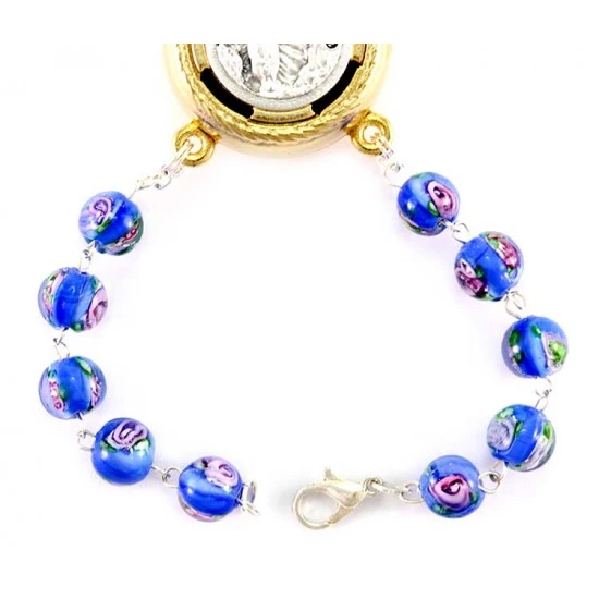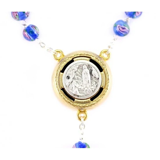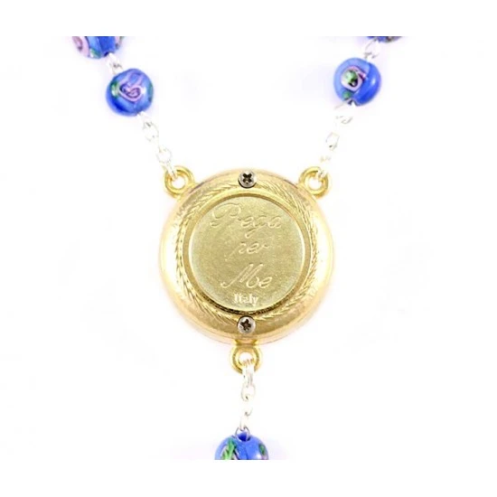 Rosario decina Ave Maria elettronico realizzato con grani in vetro colorato e legati con catenina in metallo argentato, Crocifisso pendente realizzato in metallo dorato. Il rosario è munito di gancio a molla che permette di appenderlo. La crociera raffigura la Madonna di Lourdes con scritta “Prega per me” sul retro. Per ascoltare la preghiera Ave Maria bisogna fare una lieve pressione al centro della crociera. Il prodotto funziona con pila (inclusa)