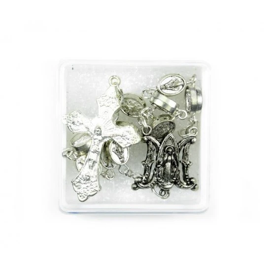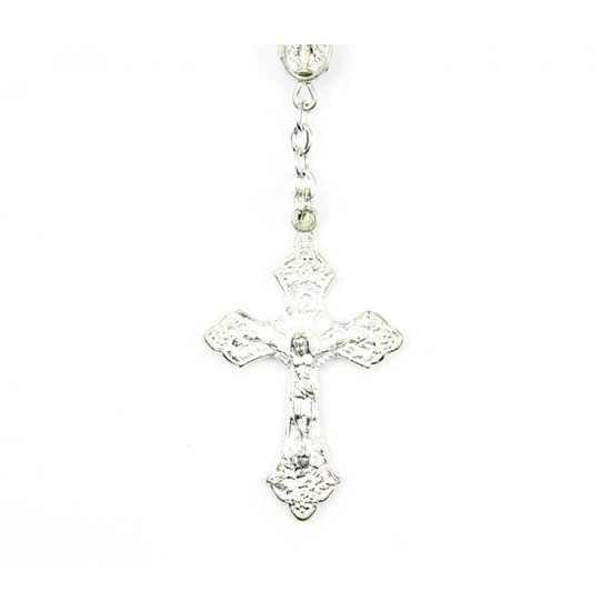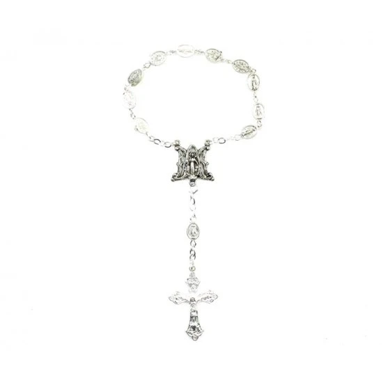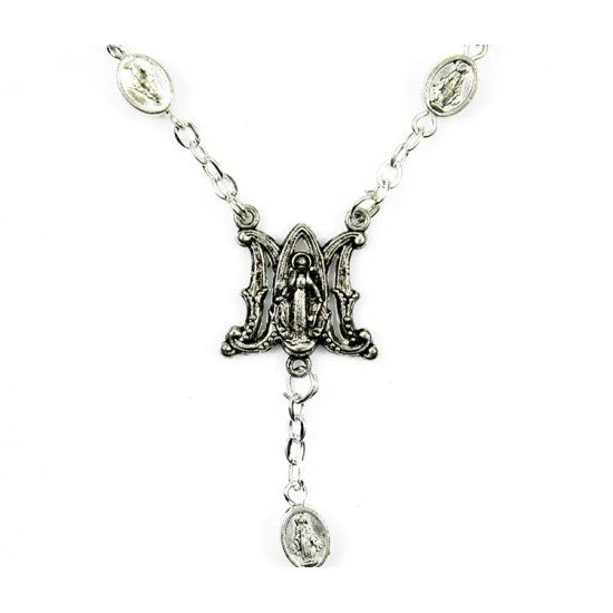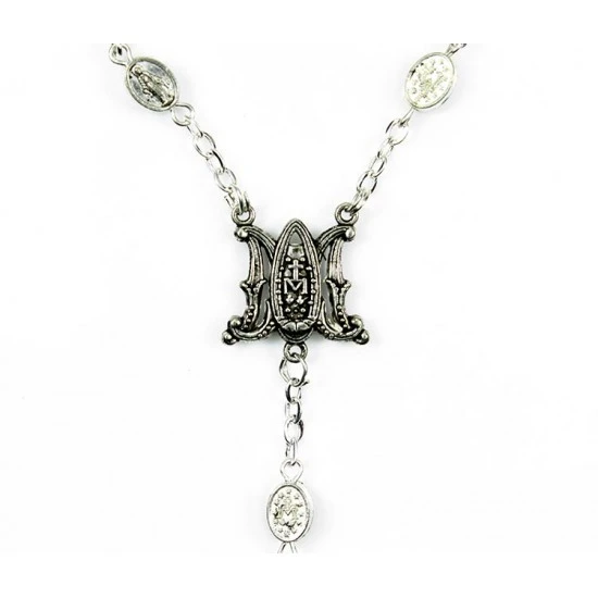 Rosario Decina con grani in metallo a forma di medaglia della Madonna Miracolosa con retro stemma. La legatura, la crociera ed il crocifisso sono in metallo argentato.