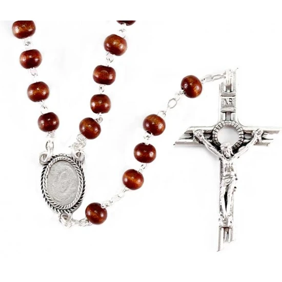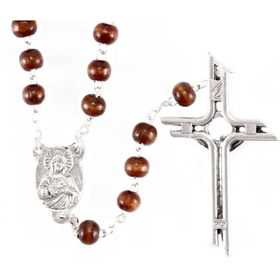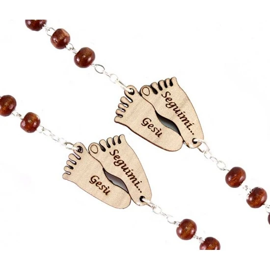Rosario del Pellegrino realizzato con grani tondi in legno e legatura in metallo argentato. I pater sono sostituiti da sagome di piedi in legno con la scritta “Seguimi Gesù”. Il Crocifisso pendente e la crociera sono realizzati in metallo argentato.