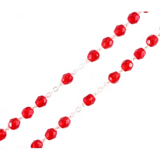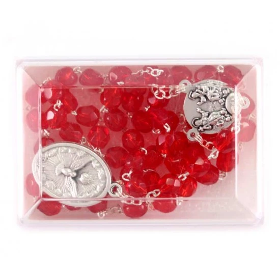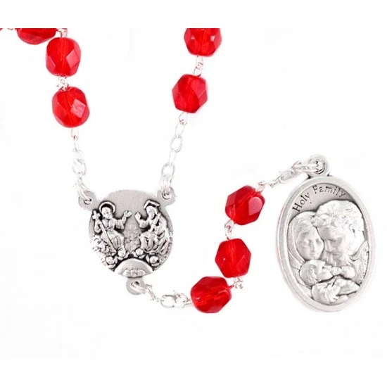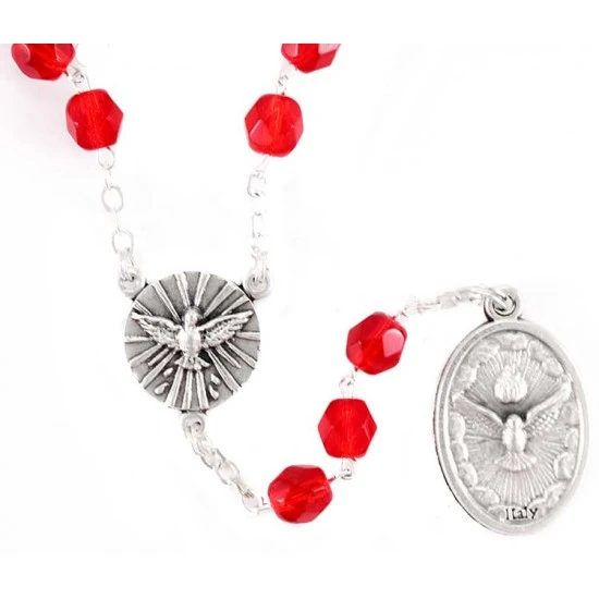 Rosario Spirito Santo realizzato con grani rossi in vetro sfaccettato composta da 7 poste di 7 grani. La medaglia in sostituzione al crocifisso pendente raffigura la colomba e la Sacra Famiglia. La legatura e la crociera sono in metallo argentato.