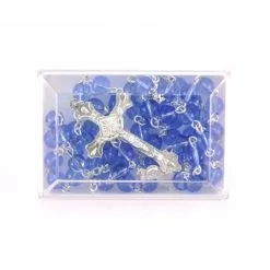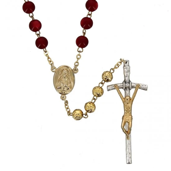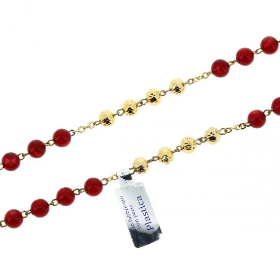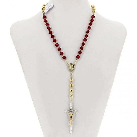 Rosario per il clero defunto realizzato con grani tondi in plastica bordeaux e grani a forma di roselline in metallo dorato, legati con catena in metallo dorato. La croce pastorale pendente è in metallo bicolore. Il rosario è corredato di scatola in plastica rigida con coperchio trasparente contenente immagine di carta del Crocifisso. Made in Italy