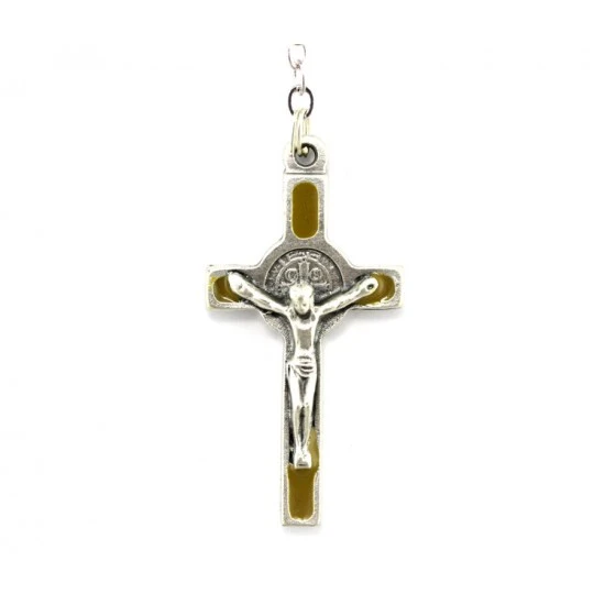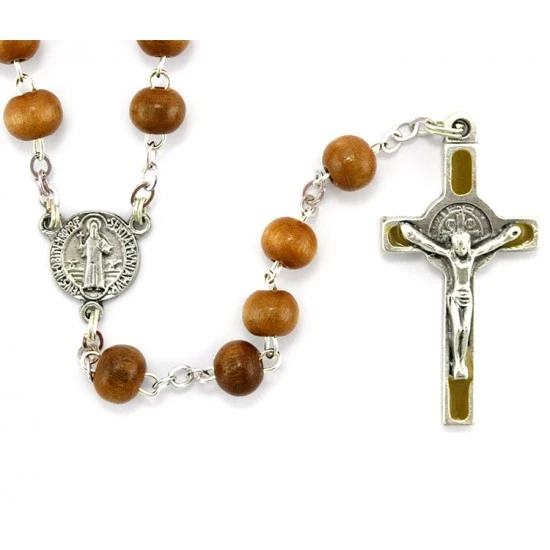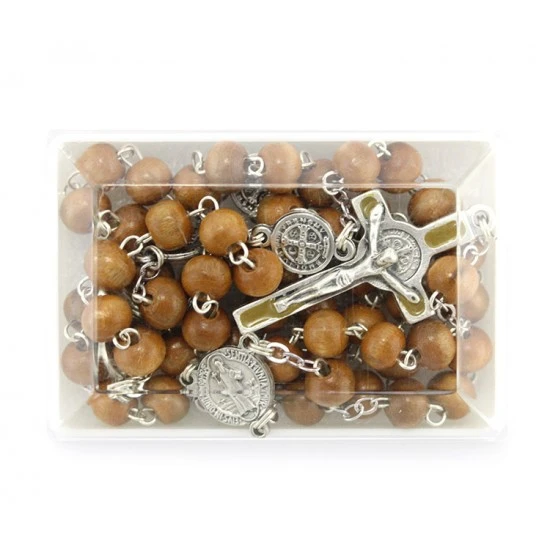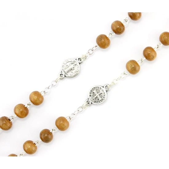 Rosario di San Benedetto con grani tondi in legno. La legatura e il crocifisso sono in metallo argentato. La crociera come i pater sono rappresentati da medaglie di San Benedetto.