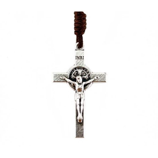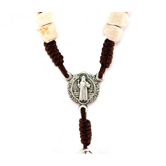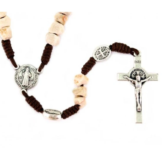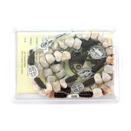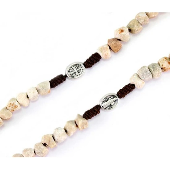 Rosario San Benedetto, realizzato con grani in pietra e legati con filo marrone. I Pater e la Crociera sono piccole medaglie di San Benedetto in metallo.