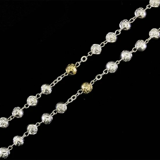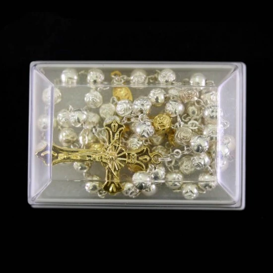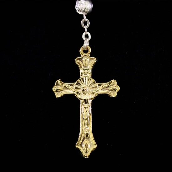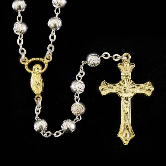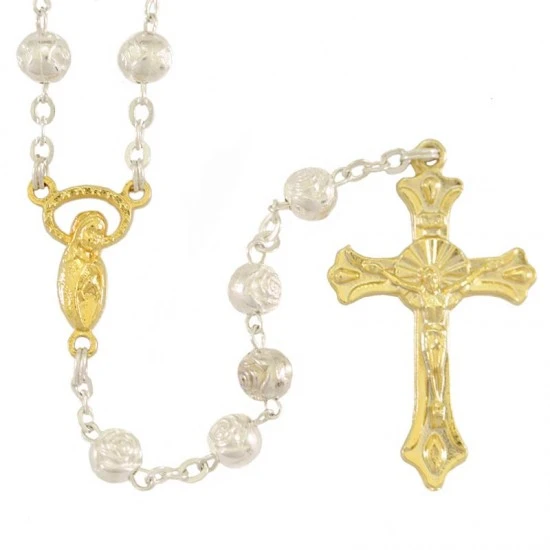 Rosario di Santa Teresa con grani tondi a forma di rosa in metallo argentato. Il crocifisso, la crociera e i pater sono in metallo dorato.