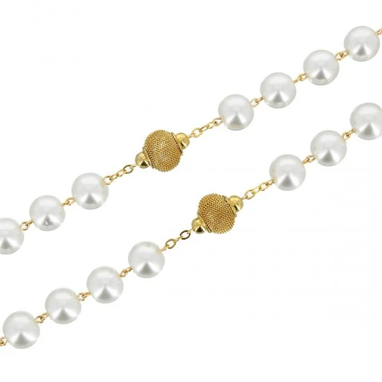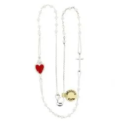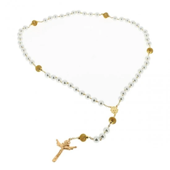 Rosario realizzato con grani tondi simil perla bianchi e pater dorati a rete legati con catenina in metallo dorato e impreziosito dalla crociera raffigurante la Medaglia Miracolosa e Croce Trinità pendente in metallo dorato. Fornita in bustina di plastica trasparente.
