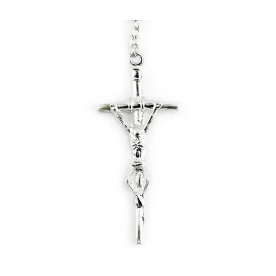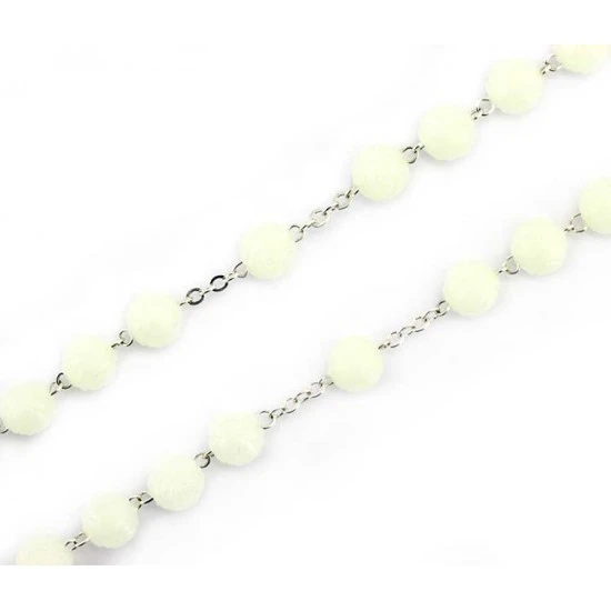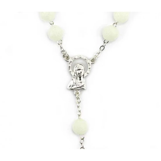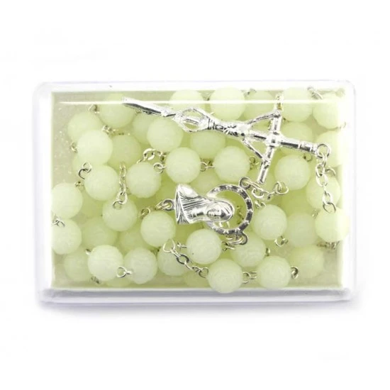 Rosario fosforescente realizzato con grani in plastica fosforescente. La legatura, crociera e Crocifisso sono in metallo argentato.