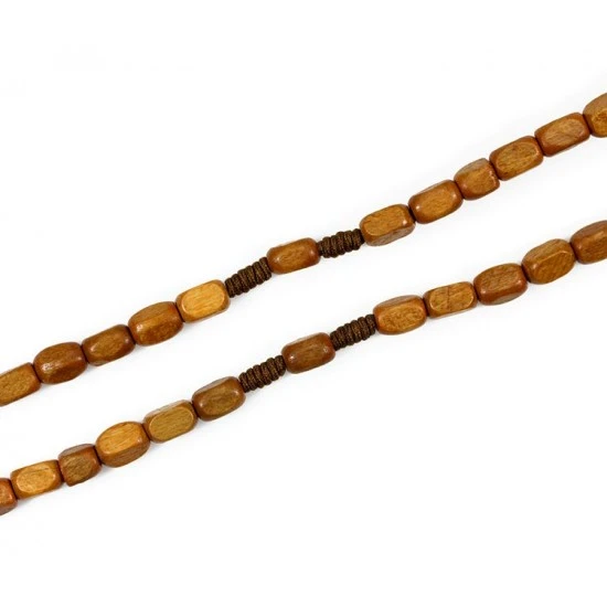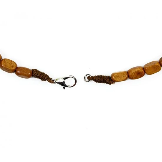 Rosario Francescano realizzato con grani a tubetto in legno e legatura in seta. Il Rosario viene munito di un comodo gancio a molla che consente di poter essere indossato.