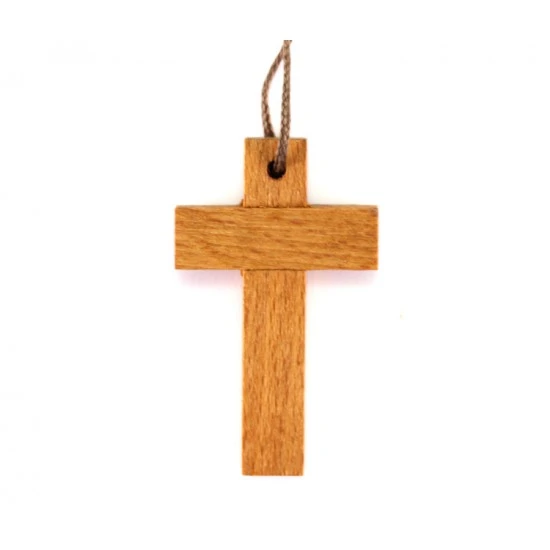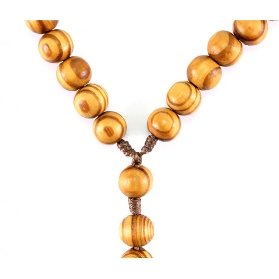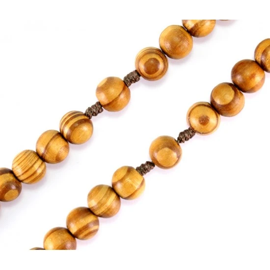 Rosario Francescano realizzato interamente a mano con grani tondi in legno chiaro e legatura in corda. Fornito in bustina plastica trasparente. Made in Italy