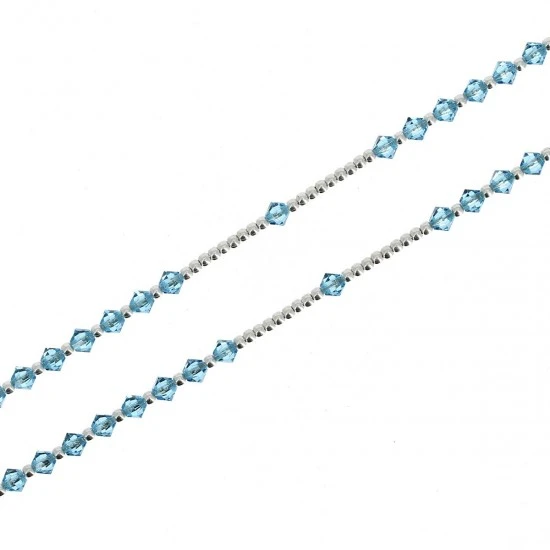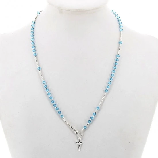 Rosario a girocollo realizzato in argento 800° con grani in swarovski celesti e crocetta pendente. Il Rosario è munito di gancio a molla per essere indossato comodamente sia al collo che come bracciale a 3 giri, fornito completo di elegante astuccio in plastica. Made in Italy