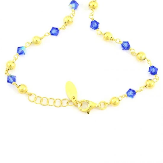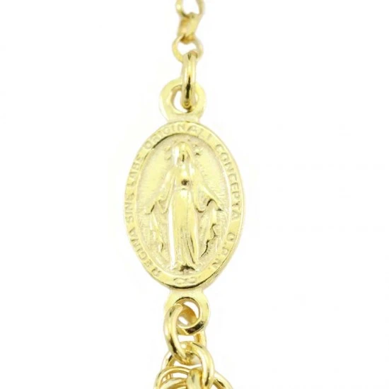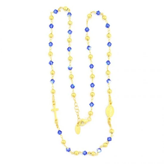 Rosario collana girocollo realizzato in argento 925 dorato e swarovski celesti, arricchito dalla medaglia della Madonna Miracolosa e crocetta orizzontali. Il rosario è munito di gancio apribile utile per essere indossato e fornito in sacchetto di velluto viola. Made in Italy