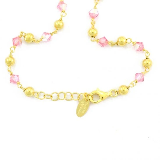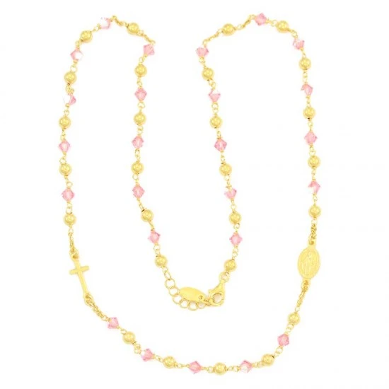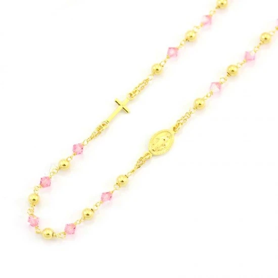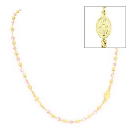 Rosario collana girocollo realizzato in argento 925 dorato e swarovski rosa, arricchito dalla medaglia della Madonna Miracolosa e crocetta orizzontali. Il rosario è munito di gancio apribile utile per essere indossato e fornito in sacchetto di velluto viola. Made in Italy