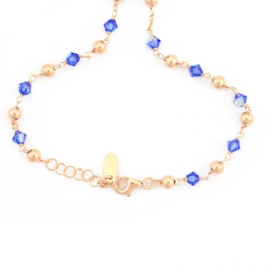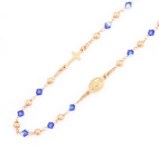 Rosario collana girocollo realizzato in argento 925 ramato e swarovski celesti, arricchito dalla medaglia della Madonna Miracolosa e crocetta orizzontali. Il rosario è munito di gancio apribile utile per essere indossato e fornito in sacchetto di velluto viola. Made in Italy