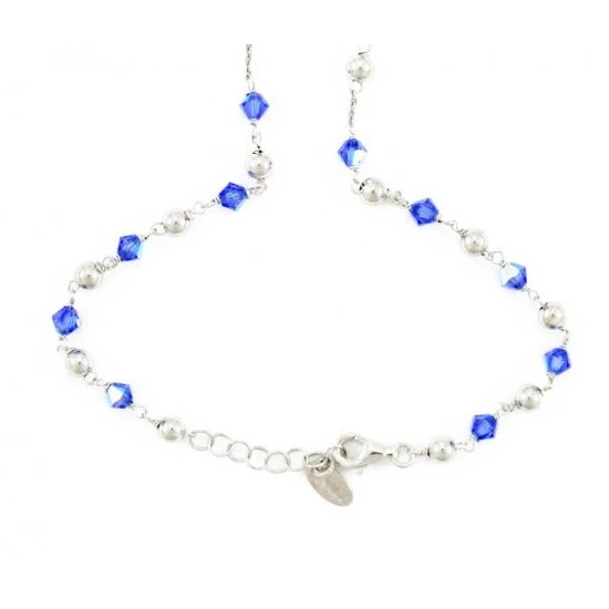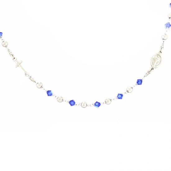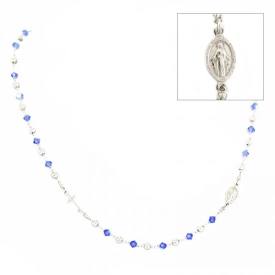 Rosario collana girocollo realizzato in argento 925 rodiato e swarovski celesti, arricchito dalla medaglia della Madonna Miracolosa e crocetta orizzontali. Il rosario è munito di gancio apribile utile per essere indossato e fornito in sacchetto di velluto viola. Made in Italy