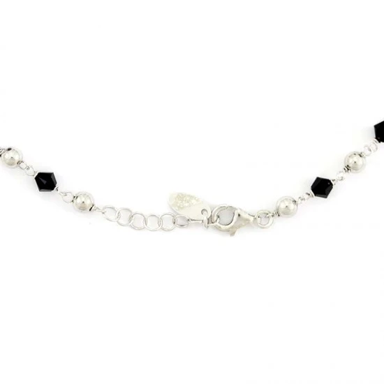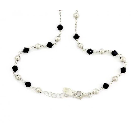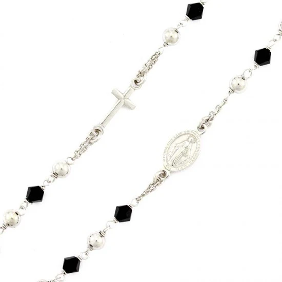 Rosario collana girocollo realizzato in argento 925 rodiato e swarovski neri, arricchito dalla medaglia della Madonna Miracolosa e crocetta orizzontali. Il rosario è munito di gancio apribile utile per essere indossato e fornito in sacchetto di velluto viola. Made in Italy