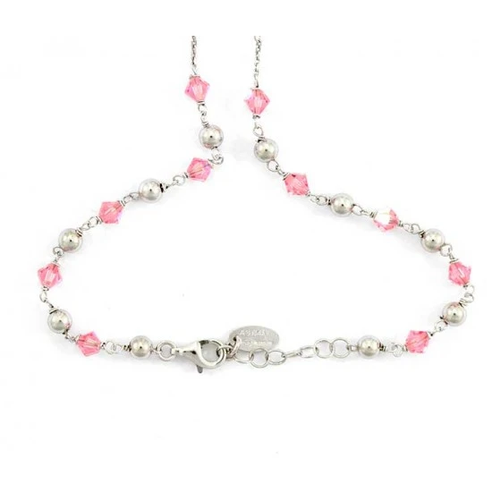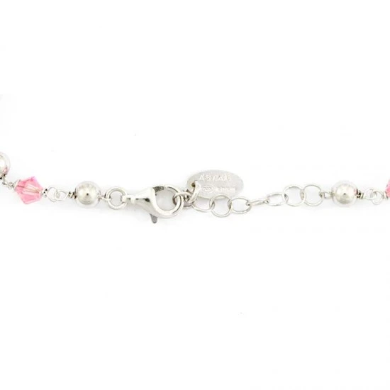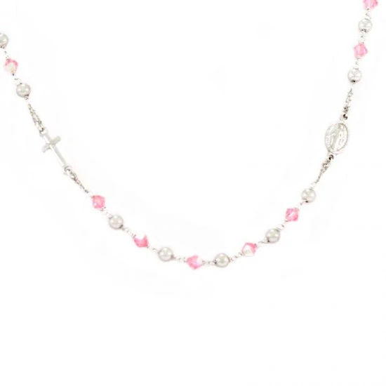 Rosario collana girocollo realizzato in argento 925 rodiato e swarovski rosa, arricchito dalla medaglia della Madonna Miracolosa e crocetta orizzontali. Il rosario è munito di gancio apribile utile per essere indossato e fornito in sacchetto di velluto viola. Made in Italy