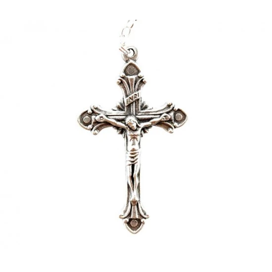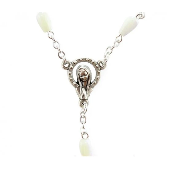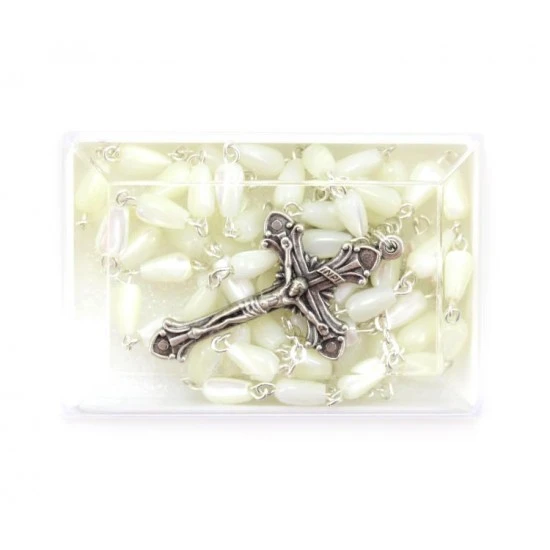 Rosario in madreperla realizzato con grani a forma di goccia in vera madreperla. La legatura, il crocifisso e la crociera sono in metallo argentato.