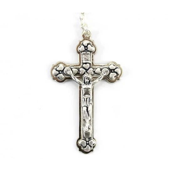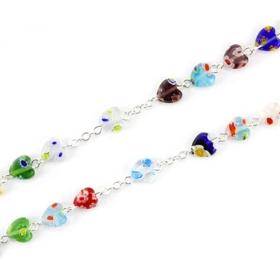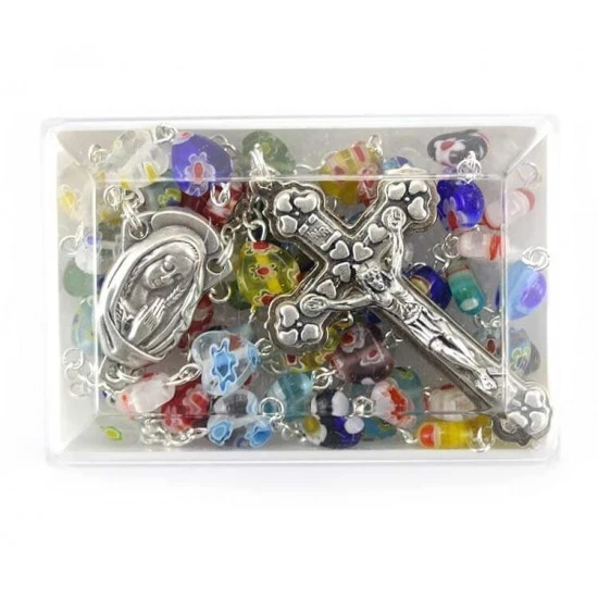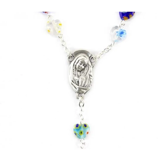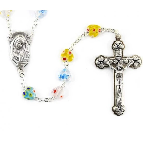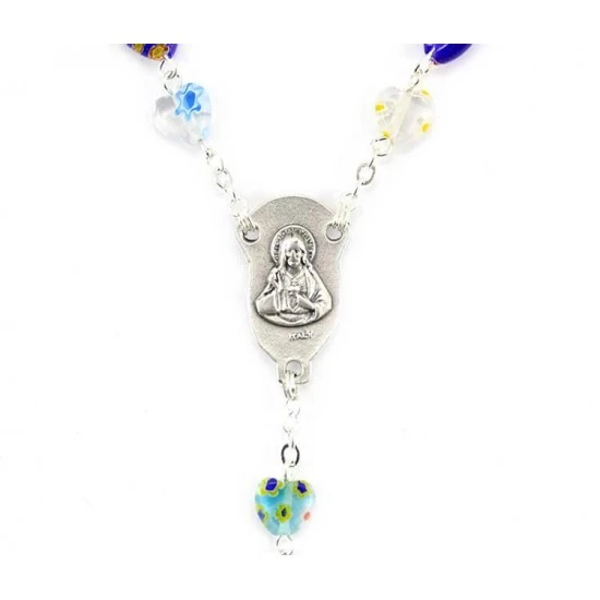 Rosario grani cuori, realizzato con grani in vetro di colore diverso a forma di cuore. La legatura, il crocifisso e la crociera sono in metallo argentato.