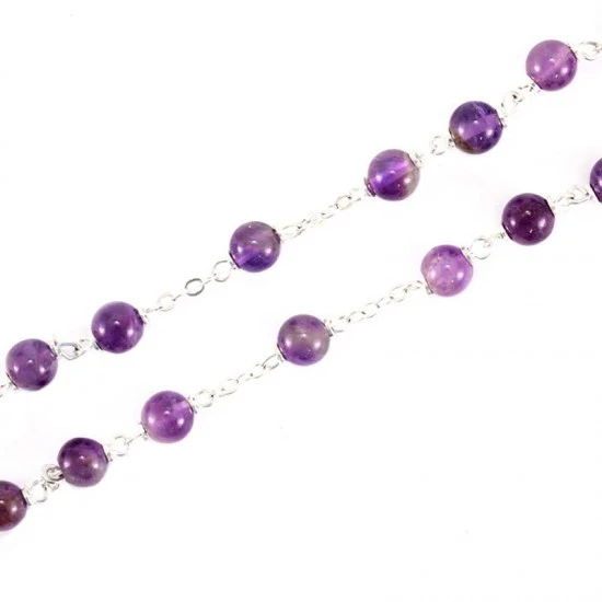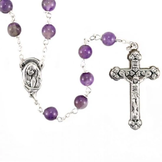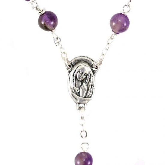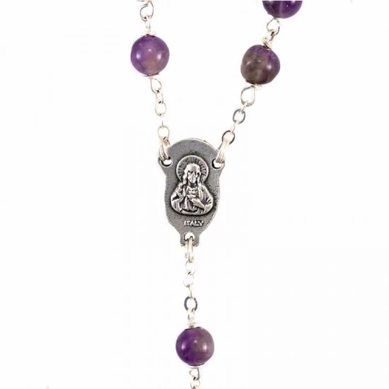 Rosario realizzato con grani tondi in vera ametista. La legatura, il crocifisso e la crociera sono in metallo argentato. Fornito completo di astuccio in plastica trasparente 4×6 cm. Made in Italy