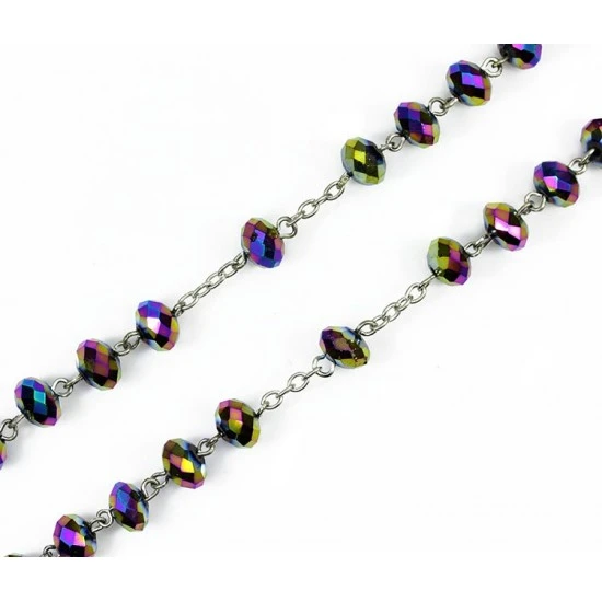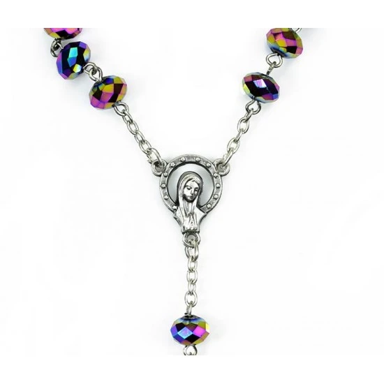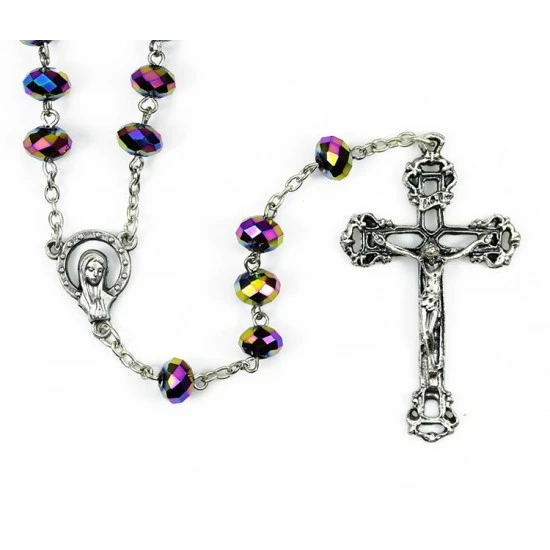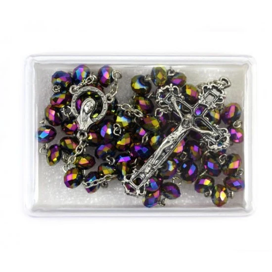 Rosario realizzato con grani in vetro sfaccettato. La legatura, il crocifisso e la crociera sono in metallo argentato. Completo di astuccio in plastica trasparente 5×7 cm.