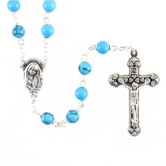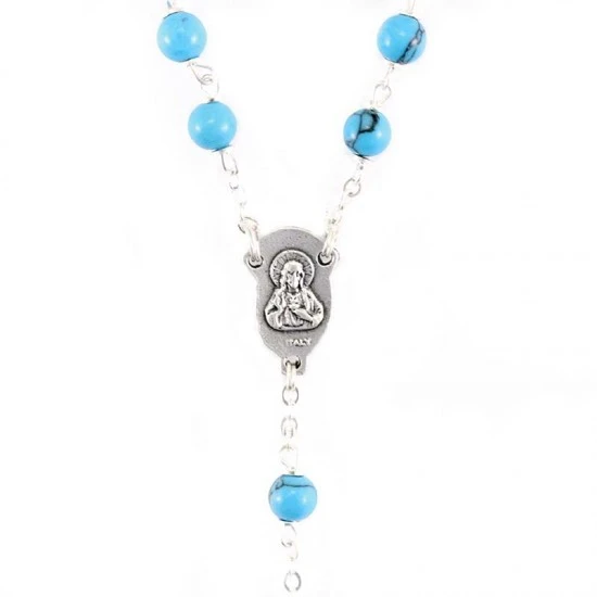 Rosario turchese, realizzato con grani in vetro circolari. La legatura, il crocifisso e la crociera sono in metallo argentato.