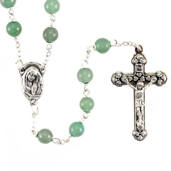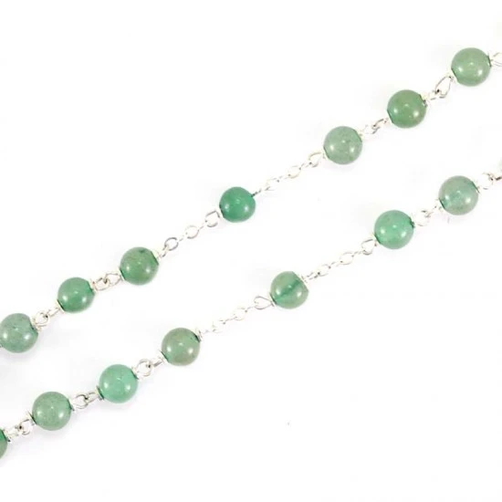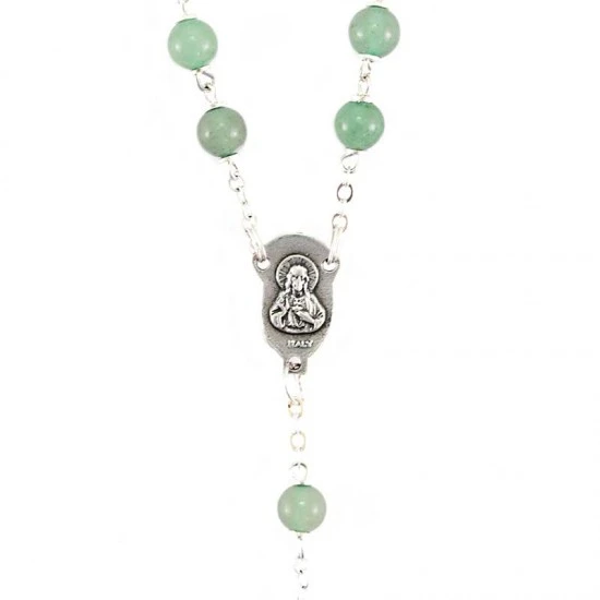Rosario vetro verde, realizzato con grani di vetro circolari. La legatura, il crocifisso e la crociera sono in metallo argentato.