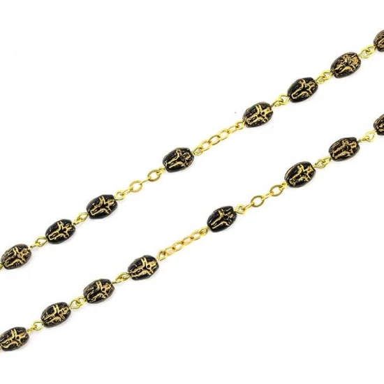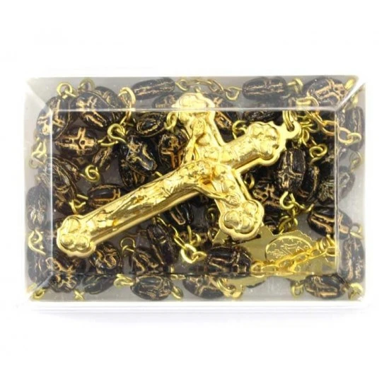 Rosario in vetro realizzato con grani ovali in vetro, sui quali sono incise delle piccoli croci. La legatura, il crocifisso e la crociera sono in metallo dorato.