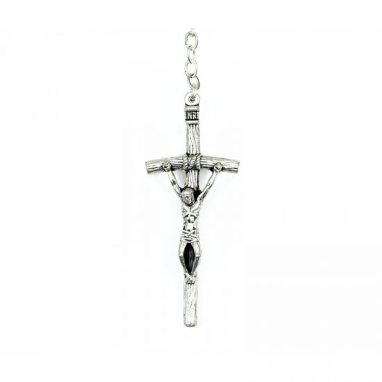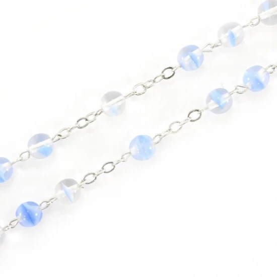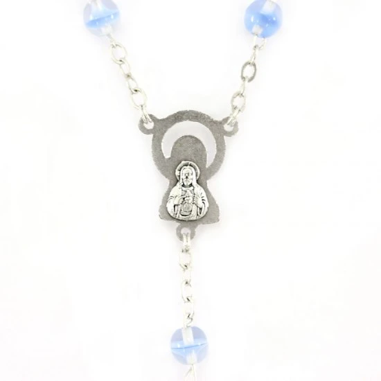 Rosario con grani tondi in vetro celeste. La legatura, il crocifisso e la crociera sono in metallo argentato.