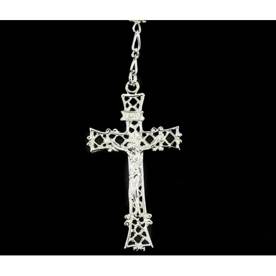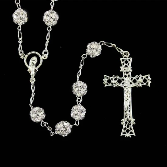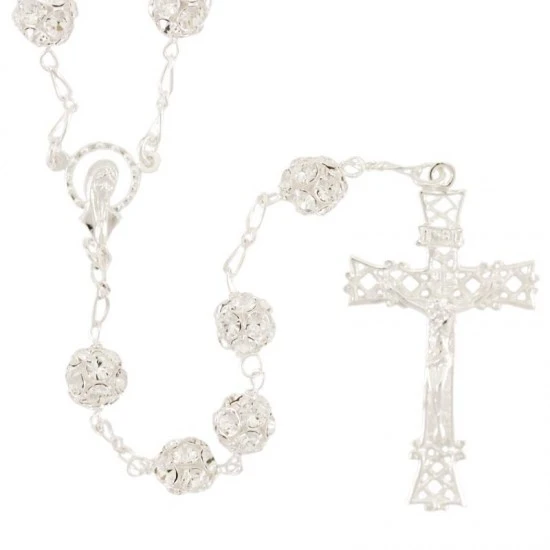 Stupendo Rosario in argento 925 realizzato con catena, crocera e Crocifisso pendente in argento e grani di cristallo composti da piccoli cristalli trasparenti incastonati in un tondo di argento. Questo Rosario molto prezioso può essere indossato anche se sprovvisto di moschettone. Fornito completo di elegante scatola di cartone colore blu. Made in Italy