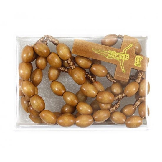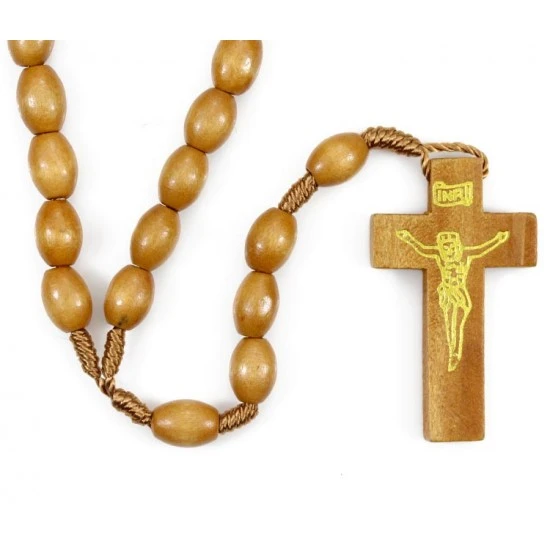 Rosario Francescano in legno chiaro, realizzato interamente a mano con grani ovali e legatura in corda.