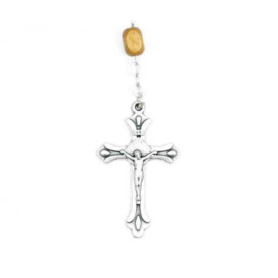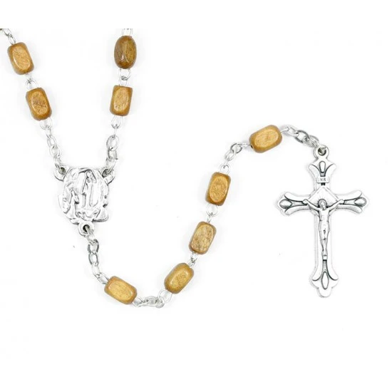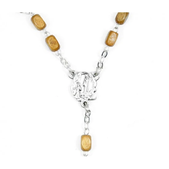 Rosario con grani a forma di parallelepipedo in legno. La legatura, il crocifisso e la crociera sono in metallo argentato.