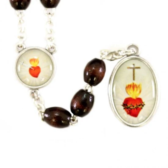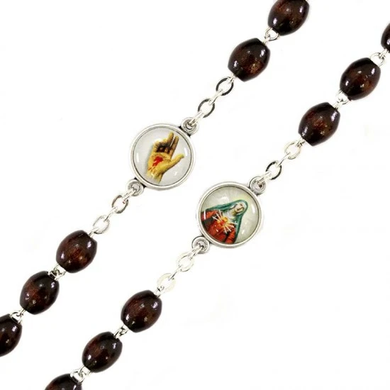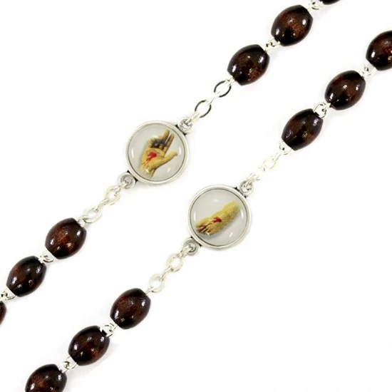Rosario devozionale Madonna delle 5 piaghe realizzato con grani ovali in legno e composto da 5 gruppi da 5 grani, ogni gruppo è diviso da una medaglia in metallo con resina colorata raffigurante le piaghe. La medaglia pendente della Madonna e la crociera sono in metallo con resina colorata. Confezionato in scatola di plastica trasparente contenente l’immagine di carta della Madonna.
