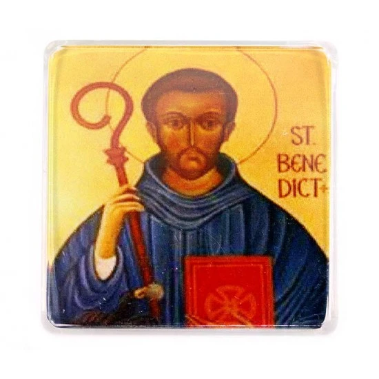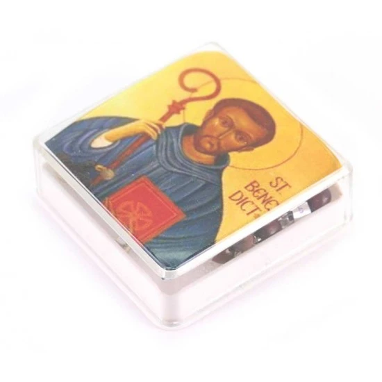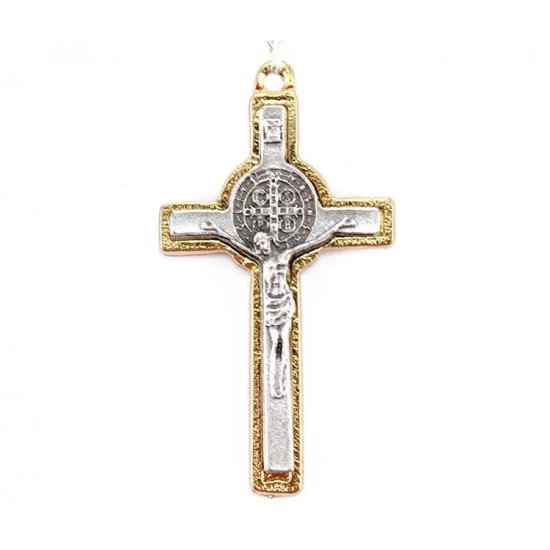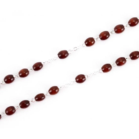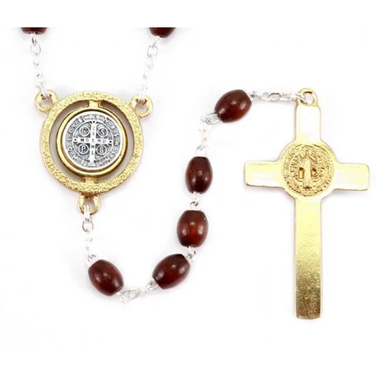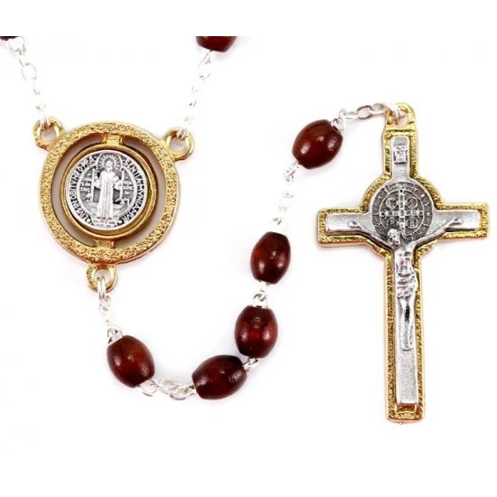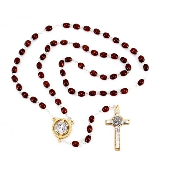 Rosario San Benedetto, realizzato con grani ovali in legno legati con catena in metallo argentato. La crociera medaglia e il crocifisso pendente sono realizzati in metallo bicolore.