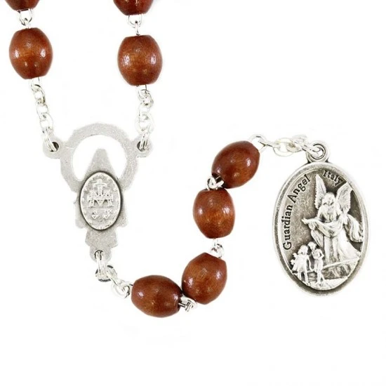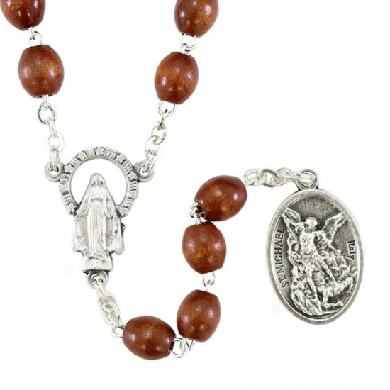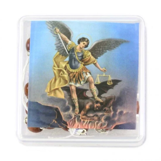 Corona da rosario di San Michele Arcangelo (detta anche corona Angelica) realizzata con grani ovali in legno marrone, composta da 9 poste di 3 grani. La legatura, la crociera e la medaglia pendente di San Michele Arcangelo, sono in metallo argentato. Confezionata in scatola di plastica trasparente contenente l’immagine di carta del Santo.