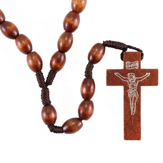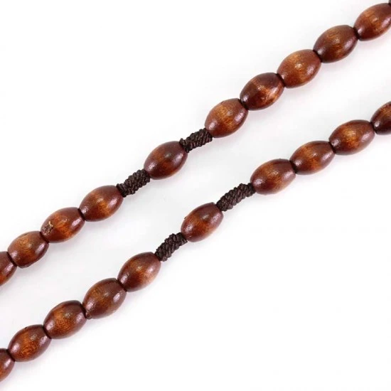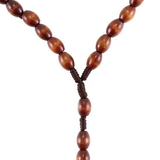 Rosario Francescano in legno scuro, realizzato interamente a mano con grani ovali e legatura in corda.
