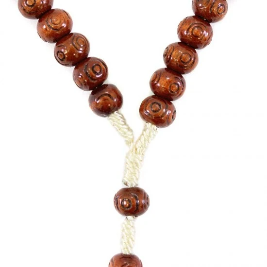 Rosario con grani in legno tondi incisi e legatura in seta.