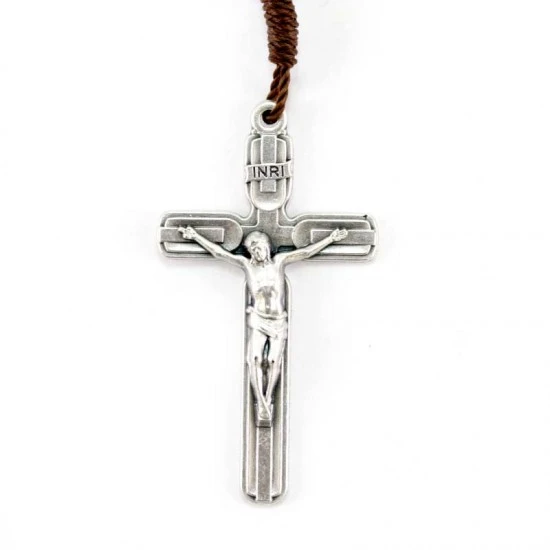 Rosario in legno con strass, realizzato con grani tondi in legno di ulivo alternati da fasce in metallo ricoperte di strass e legati con spago marrone. La crociera e il crocifisso pendente sono in metallo argentato. Il rosario è munito di gancio a molla per essere indossato comodamente. Made in Italy