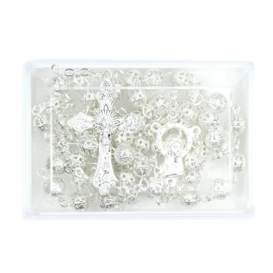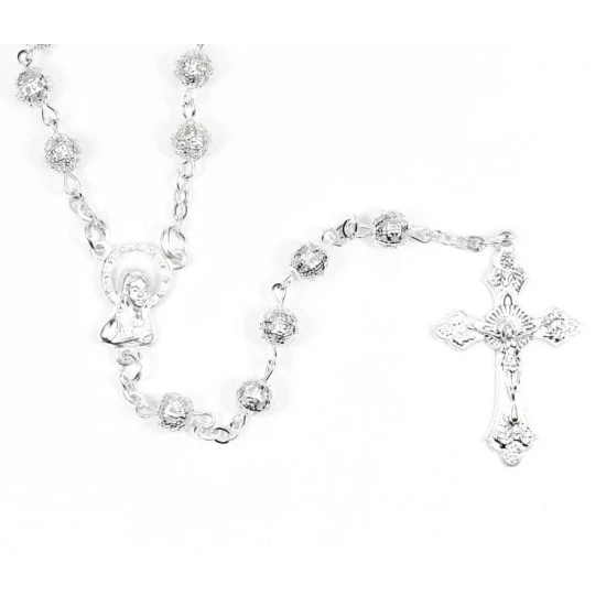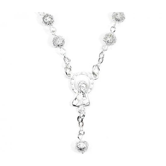 Rosario con grani tondi in metallo filigrana, la legatura, il crocifisso e la crociera sono in metallo argentato.