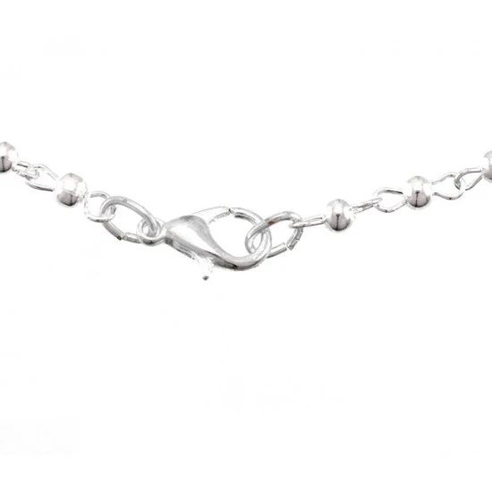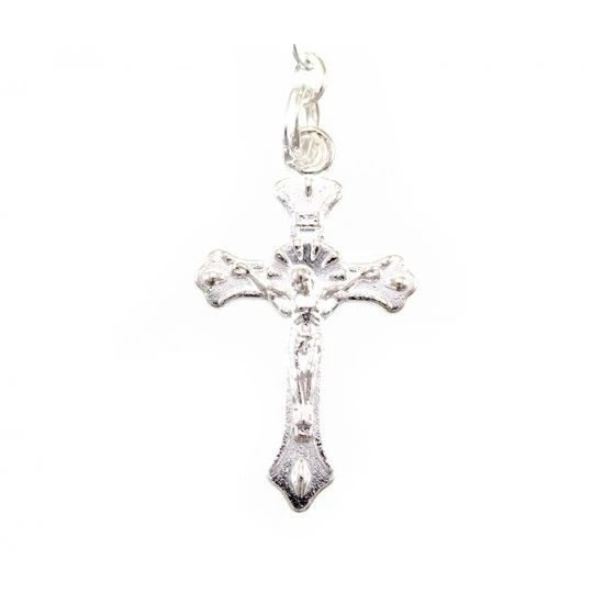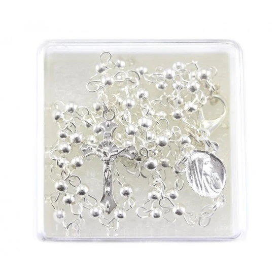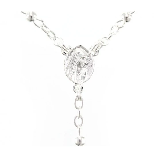 Rosario con grani tondi in metallo. La legatura, il crocifisso e la crociera sono in metallo argentato. La corona è munita di gancio a molla per essere indossata.