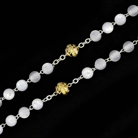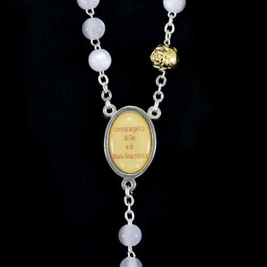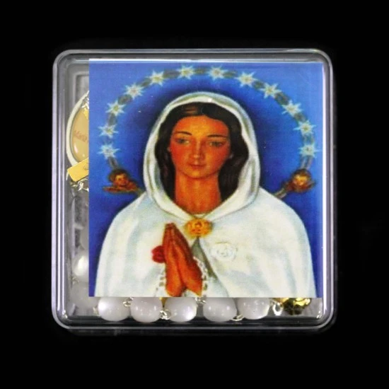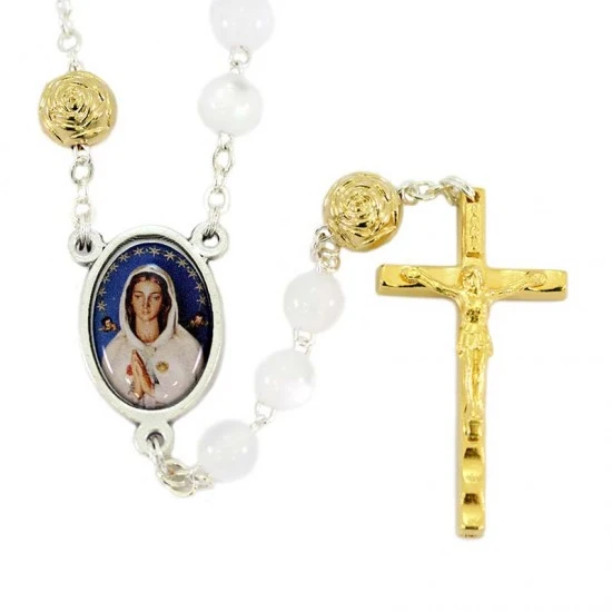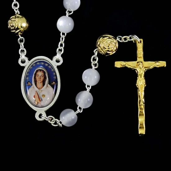 Rosario Madonna Rosa Mistica realizzato con grani tondi in plastica bianca e pater a forma di rosa dorati, legati con catena in metallo argentato. La crociera in resina colorata raffigura l’immagine della Madonna. Crocifisso pendente in metallo dorato. Confezionato in scatola di plastica trasparente contenente l’immagine di carta della Madonna.