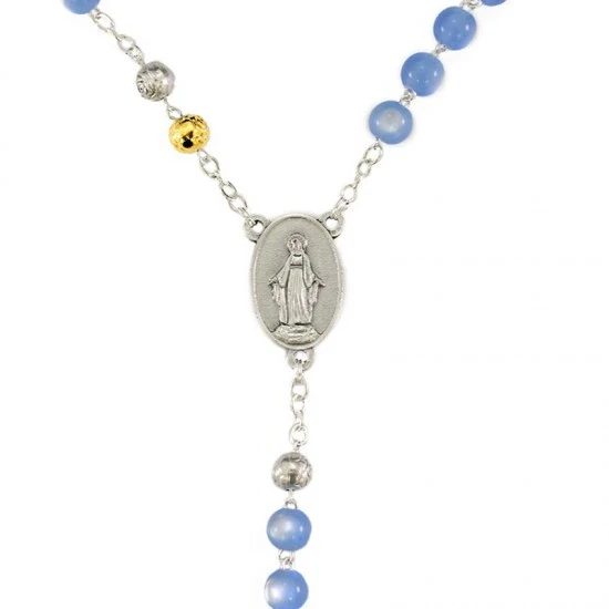 Rosario Santa Brigida realizzato con grani tondi in plastica celeste e legati con catena in metallo argentato. La crociera in resina colorata raffigura l’immagine della Santa, Crocifisso pendente in metallo bicolore. Confezionato in scatola di plastica trasparente contenente l’immagine di carta della Santa.