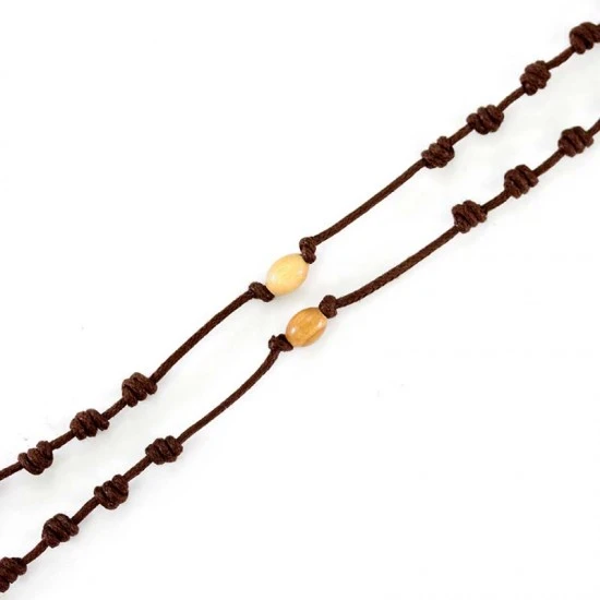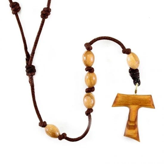 Rosario collana realizzato interamente in spago con 9 grani e tau pendente in legno di ulivo.