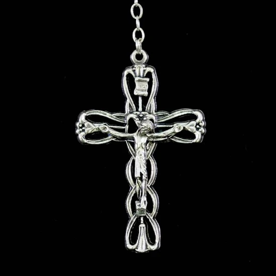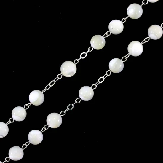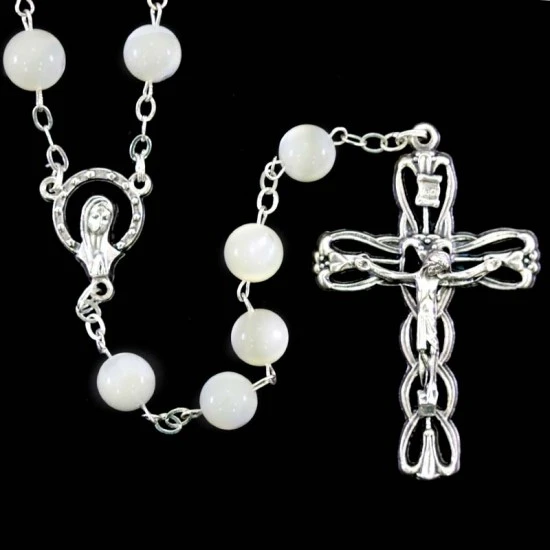 Rosario in madreperla realizzato con grani tondi in vera madreperla. La legatura, il crocifisso e la crociera sono in metallo argentato.