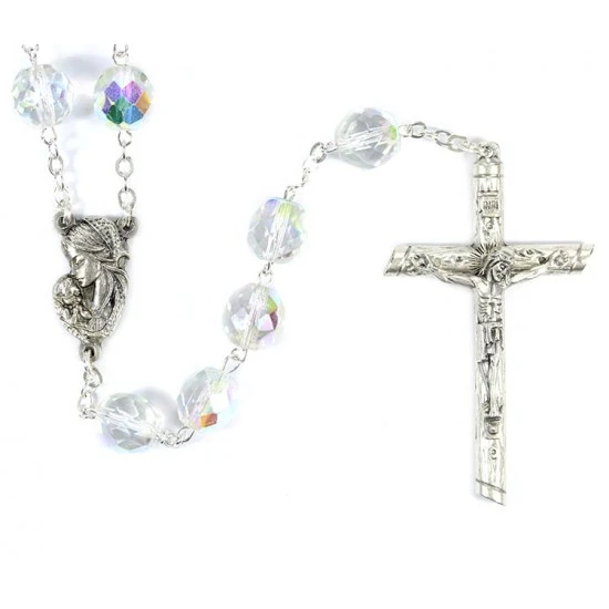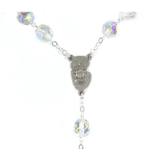 Rosario con grani in vetro sfaccettato. La legatura, il crocifisso pastorale e la crociera sono in metallo argentato.