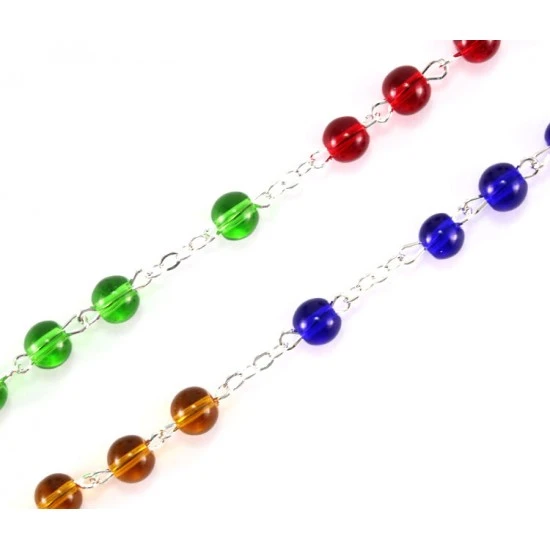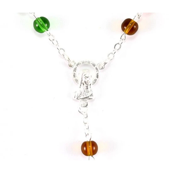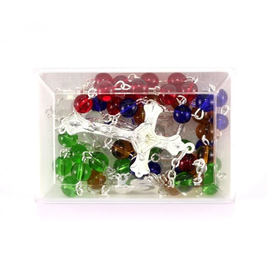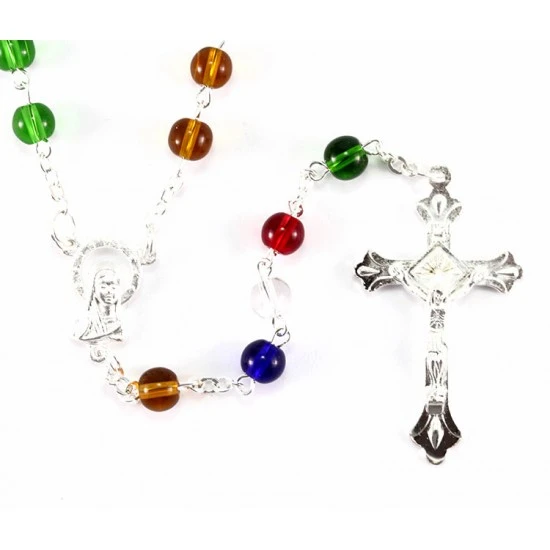 Rosario Missionario in vetro realizzato con grani tondi in vetro liscio. La legatura, il crocifisso e la crociera sono in metallo argentato.