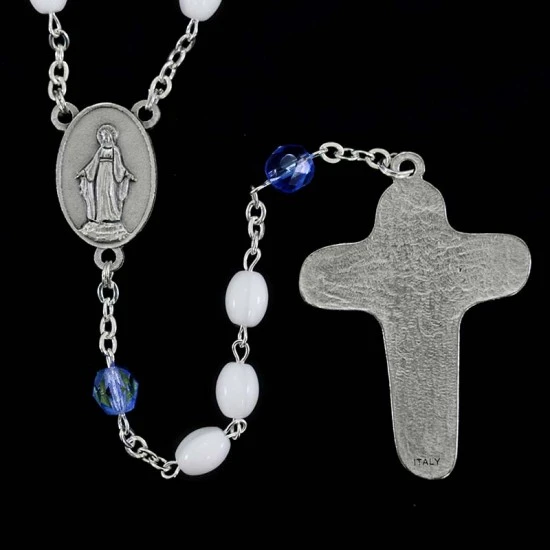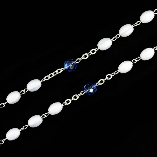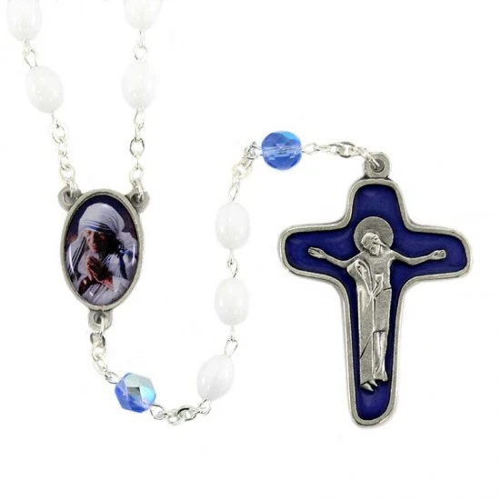 Rosario Santa Teresa di Calcutta realizzato con grani ovali in vetro bianco e pater in vetro celeste sfaccettato, legati con catena in metallo. Il Crocifisso e la crociera sono in metallo smaltato. Confezionato in scatola di plastica trasparente contenente l’immagine di carta della Madonna.